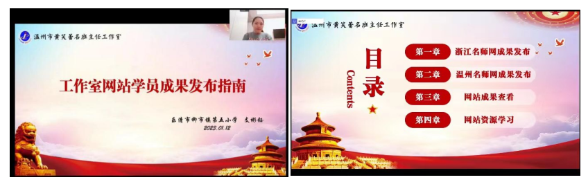 紧接着,学员支彬钰老师为大家做了《工作室网站学员成果发布指南》的细致讲解。作为信息部助理,她勤奋好学,在导师的指导下,她率先研究了网站成果发布流程,并手把手教会学员操作步骤,讲解中,她当场进入浙江名师网、温州名师网工作室页面,教会学员如何查阅网站成果、网站文章、资源发布等进行现场演示,一步一步耐心地操作讲解,把自己所掌握的全部技能分享给工作室的每位学员。