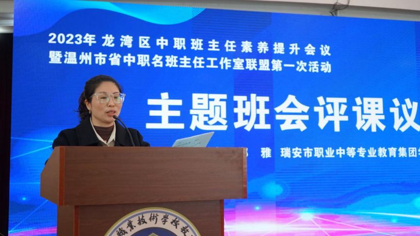 温州市教育教学研究院周丽芳老师向与会嘉宾隆重介绍省成长导师工作室及省名班主任工作室主持人经历,回顾近年来温州市中职班主任队伍发展所取得丰硕成果。她希望各工作室主持人以“专业引领、同伴互助、共同发展”为宗旨,为打造温州市高水平中职班主任队伍建设和德育成果贡献新的力量。