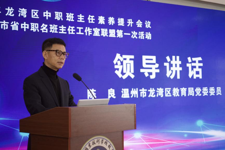 龙湾区教育局党委委员陈良同志代表龙湾区教育局向工作室主持人及工作室成员致以热烈的祝贺。他细数了近些年龙湾教育所取得的优秀成绩,指出奋力构建未来教育新生态,推动全区教育事业发展,关键在于强化教师队伍建设,建设高质量班主任队伍。他认为温州市省名班主任工作室联盟必将会引领和带动龙湾区、温州市、乃至浙江省中职班主任队伍建设,他表示龙湾区教育局也将为“名班主任工作室“联盟建设提供有力保障,他希望各工作室办出特色,办出成绩,为温州教育做出更大贡献。