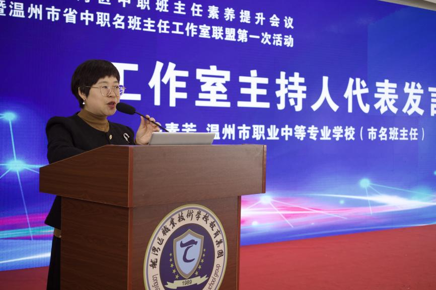 温职专任素芳老师代表工作室主持人发言,她倡议工作室联盟主持人应树立“互相学习、互相促进、教学相长、共同提高”的工作理念,秉承“追求卓越、提升自我、带动辐射”的工作目标,以“带队伍、做示范、育名师、创品牌”为建设路径,使工作室成为“名班主任成长的摇篮、资源辐射的中心、教育科研的基地”,努力实现“四个一”:带好一个团队、抓好一个专题、做好一次展示、拿出一批成果,为温州中职班主任工作发展贡献力量。
