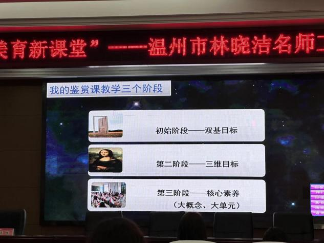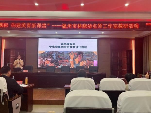 这次活动还非常荣幸的请到丽水缙云美术教研员潘珣老师来到现场指导,她带来的专题讲座《新时代教师专业成长》。潘老师首先分享了自己的成长故事,从名师的个人成长经历中,学到了教育是农业,需要静待花开。当教师,首先要树立以慢为快的职业发展周期,急于求成不适合教师行业。在格局上,博大的胸怀成就理想的未来;在心态上,要把工作当作事业去做。然后潘老师分享了追求理解的中小学美术鉴赏教学设计例谈,推荐了书籍和读书方法,并分享了优秀案例和自己执教的优质课案例。心怀大概念,围绕一些主题思想和核心问题组织教学,学生获得的不仅仅是美术知识,更是对于美术丰富持久的理解。