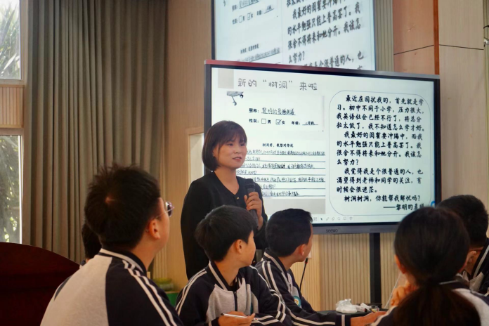 之后,施思老师为大家带来了八下第六单元起始课《循迹·寻技》。课前,施老师布置了预学任务:借助单元提示语,归纳本单元文章的共同特点以及学习重点。课上,施老师以“解忧树洞”公众号收到的私信作为导入,接着出示公众号小编的私信回复,让学生自主找出回复中存在的问题,从而顺势引出要向先贤学习“论事说理的技巧”。在明确单元学习重点之后,施老师又引导学生借助助学系统(预习、思考探究以及作业本等)通过小组合作梳理各课的学习重点。最后,再让学生思考,所整理的学习要点中,哪些能够帮助小编的回复更有感染力和说服力。通过以上环节的设置,让学生对第六单元有了更深刻的了解,帮助学生更好地开启第六单元的学习。
