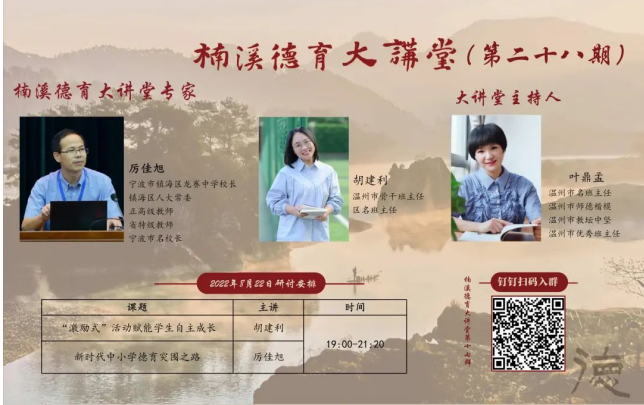 高温酷暑,却无法停止我们潜心研修的热情。8月22日晚7点,楠溪德育大讲台第28期研讨活动如约而至。本次活动邀请到了中学正高级教师、省特级教师、宁波镇海区龙赛中学校长厉佳旭和温州市骨干班主任胡建利老师。活动由温州市名班主任、师德楷模、优秀班主任和教坛中坚叶鼎孟老师的主持。