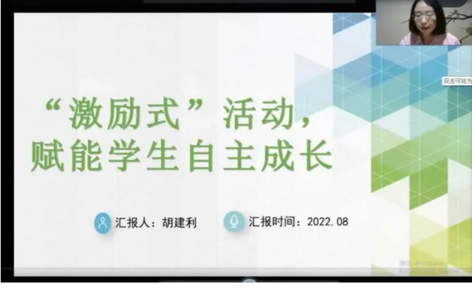 首先,温州市骨干班主任胡建利老师为大家带来了《激励式活动,赋能学生自主成长》主题发言。胡老师以罗森塔尔效应为理论依托,以班级活动为载体,从聚焦目标、挖掘潜力,聚焦赏识、续航动力,聚焦过程、自主活力三个角度开展了层层递进、环环相扣的带班体验分享。