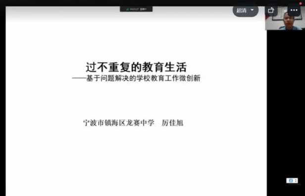 随后,中学正高级教师、省特级教师、宁波镇海区龙赛中学校长厉佳旭以《过不重复的教育生活——基于问题解决的学校教育工作微创新》为主题,结合大量的工作思考和案例,从教育问题的发现、问题的承认和问题的解决三个角度与大家分享了对教师责任、勇气和智慧的理解和分析,强调了工作创新的重要作用和意义。