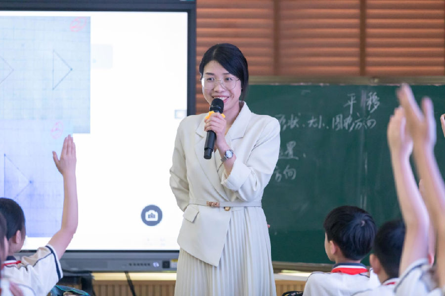 课堂上,李老师从学生熟悉的旋转现象引入,设计了想一想、转一转、画一画等大量操作活动,给予学生充分的时间进行观察、想象、实践。从线段的旋转到三角形的旋转,学生利用身边的素材想一想,动手做一做,画一画,不断地从具体情境中抽象出数学知识,在李老师循序渐进的提问中,学生一步步领悟出旋转三要素,更是紧紧抓住旋转三要素发现旋转的本质,积累几何活动经验。在这节数学课上,李老师立足新课标,发展学生空间观念,引导学生用数学的眼光去观察生活、感受数学之美。
