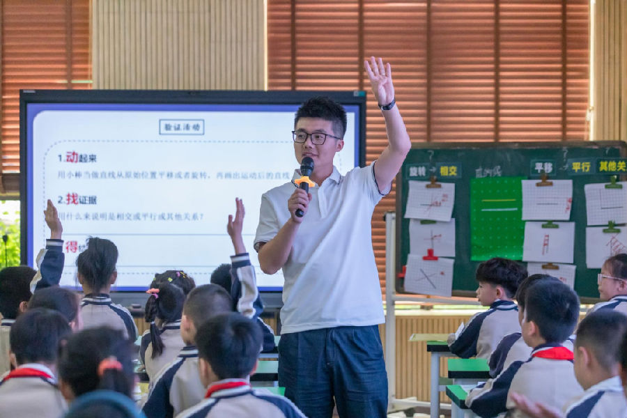 第三节课,顾老师通过“一条直线经过平移或旋转运动后,和运动前的直线会是什么关系”这一问题引发学生思考这两条直线会存在什么样的位置关系。从猜想到验证,学生利用各种不同的学习素材去想象、去探究、去找证据验证,培养了学生的空间想象能力以及合作探究的学习意识。通过继续研究相交这一位置关系,找角的特点得到垂直这一特殊情况,顾老师恰到好处地引导,学生津津有味地学,培养了自主整理概念的能力,整堂课扎实有效。