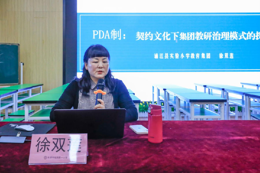 下午的活动是浦江县实验小学校长徐双莲老师带来的讲座《PDA制:契约文化下小学数学教研治理模式的探索》。徐老师介绍了自己学校在“契约文化”引领下,从“小鬼有约”到“教师有约”到“集团有约”再到“36有约”的探索过程以及达到的成效。“PDA制”——P指项目呈现,D指驱动认领,A指自主成长,从项目到驱动再到成长,徐老师重点围绕“36(专业领域)”、“18(素养提升)”、“6x(幸福生活)”这三个数展开谈教师成长,给了我们很多启示。
