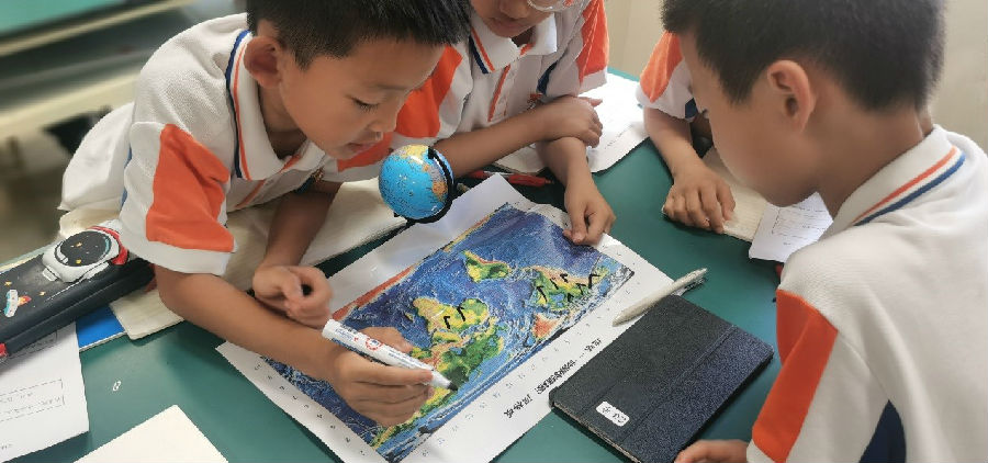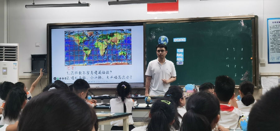 而后,由杨峰富老师带来课例《地球——水的星球》。杨老师亲和的开场有趣的导入让孩子们对地球非常有兴趣。聚焦“地球独特之处”,引发孩子们对地球有水有生命的思考。课堂中的第一个活动:观察地球的水域。孩子们在观察地球以的基础上,对海洋,河流,湖泊有了认识。那水域占了地球的多少面积呢?杨老师顺势引出比较海洋和陆地面积的活动。这是一个较难的活动,杨老师借助微课讲解了统计的方法,降低了活动难度,让孩子得以有效完成。在数据呈现之后,孩子们发现了地球——水的星球原来如此。