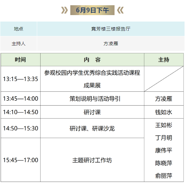 为充分发挥新时代综合实践活动课程的实践育人功能,推进浙江省综合实践活动课程的常态化、高质量建设。浙江省教育学会综合实践活动课程分会将于6月9日至10日举办“五育融合视野下的综合实践活动课程建设”主题研讨活动,本工作组织各学员进行网上观摩活动(工作室钉钉群),请各位安排好时间,准时收看直播,现将有关事项通知如下: