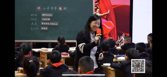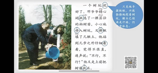 重庆大学城树人小学的冯栎钧老师给我们带来了录像观摩课《邓小平爷爷植树》,邓爷爷是一个伟大的党的领导人,是一个平易近人的好爷爷。冯老师的课注意勾连单元的内容,通过话题“春天”引出含有春天的古诗,绘本回忆单元内容,再通过介绍邓小平把3月12日定为植树节,说邓爷爷送给春天的礼物是植树,引出课文。本课的教学重点是讲好邓爷爷植树的段落,冯老师精心设计四字词语认读、写字环节,让他们成为孩子讲故事的支架,帮助学生讲好这个段落。通过构建学习任务群,引导孩子关注邓爷爷植树的神态和动作描写,从细致的描写中感受人物形象。
