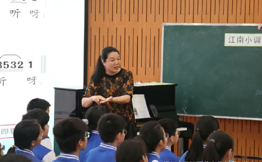 第三节课是由龙湾区实验中学的黄素燕老师执教《无锡景》。黄老师紧抓江南小调细腻委婉的风格特点,带领学生自然地融入并走进了江南水乡情境。教学过程由浅入深,循序渐进,层层铺垫,环环相扣,从入境——入歌——入乡——入韵——入情等环节展开教学,并对歌曲的语言、节奏、旋律、调式与曲式结构等方面,让学生通过各种方式的演唱体验音乐特点后深度剖析。拓展部分,黄老师以北京小曲《探清水河》作对比欣赏,启发学生认识到两者之间的关联,并通过微视频欣赏让学生了解民歌小调在流传过程中的变异性特点。整节课既有歌唱教学,又有欣赏教学内容,让学生在多样化的教学中体验音乐感悟音乐,过程行云流水,高潮迭起,黄老师的教学充分展现了一位名师教学的深度、高度和温度。