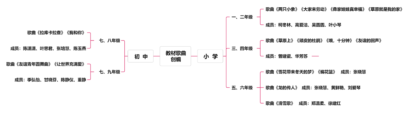 教材歌曲的多声部创作和改编是中小学教师应该具备的专业能力,为提高学员的综合素养和课堂教学运用能力,7月初钱老师布置 “教材歌曲多声部创编” 作业,学员们进行了一年级至九年级教材作品梳理,分组合作创编。
