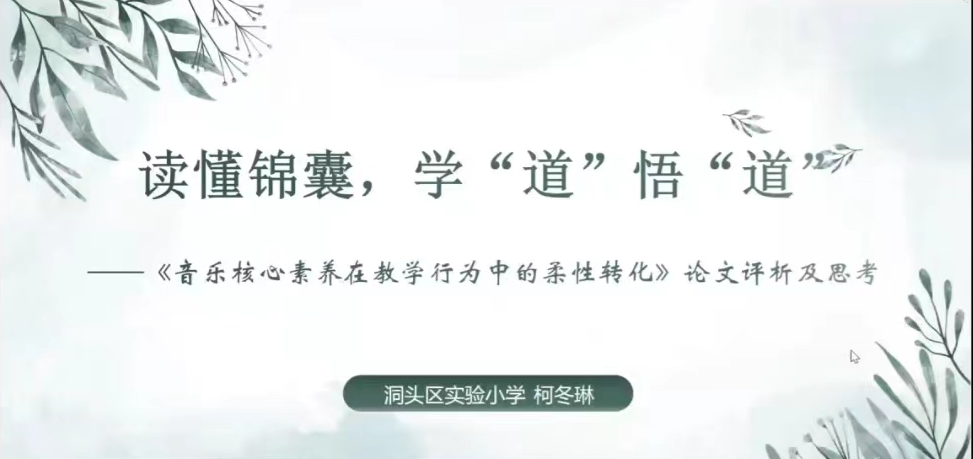 柯冬琳老师以主题《读懂锦囊,学“道”悟“道”》分享了她对钱瑞华老师论文《音乐核心素养在教学行为中的柔性转化》的评析与思考,她从四个方面入手:选题精妙,关注困局(要点“小切口大问题、扣实际抓细节”);观点明确,凸显美育;行文脉络,梳理清晰;触类旁通,引发思考(强调教学需要智慧型、需要个性化)。柯老师最后感慨:学生有“爱美、审美”的权利和需求,只有从狭隘的音乐课堂观中走出来,学生才能获得自由身、生命感,我们才能探出一条有生命气息的艺术路。