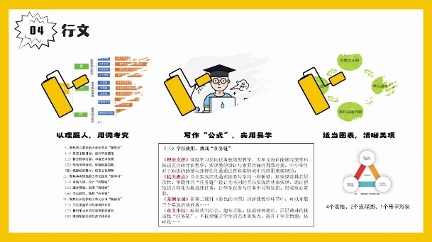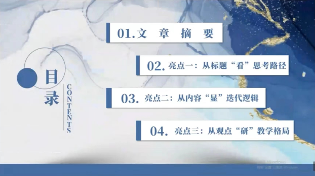 董老师再从正文内容第一块展开论证内容的实:一是钱老师对于课标的摘抄和自己理解的复述;二是以深入课例,还原课堂。最后感叹行文“三妙”:沉浸之技,读者不易游离;叙事之技,尽显专家魅力;共情之技,收获共鸣传递。