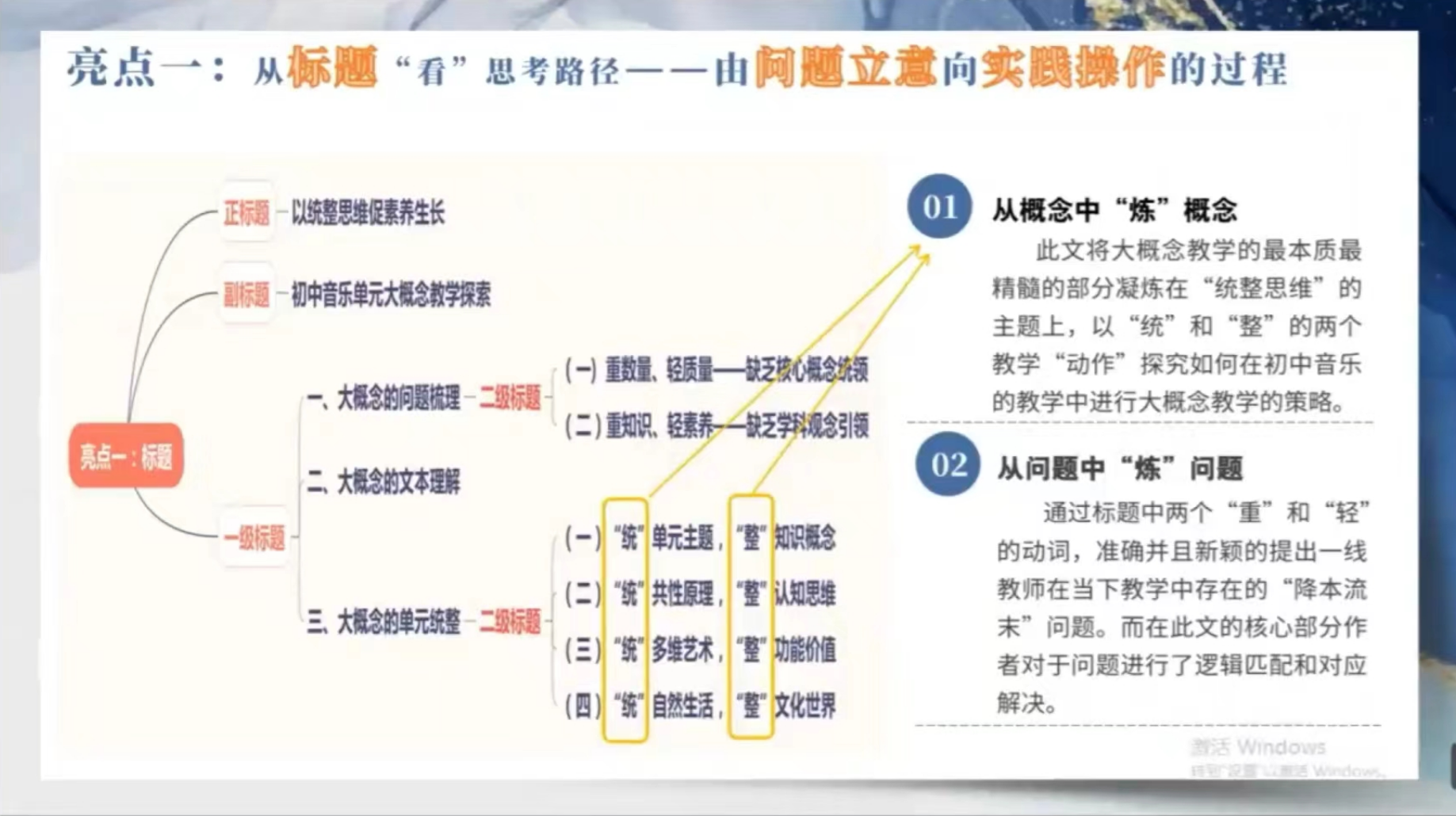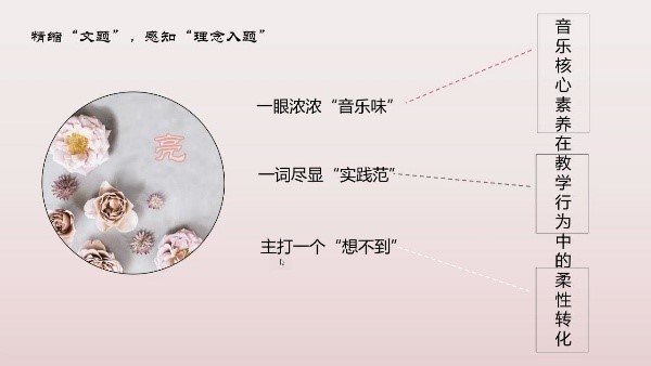 董静老师以揭秘的方式再次分享钱老师论文《音乐核心素养在教学行为中的柔性转化》,从大标题感受 “一眼浓浓“音乐味”、一词尽显“实践范”、主打一个“想不到”;小标题“逻辑性、层次性”,揭示好的论文一定是选题新、表述新,要体现出教育教学新理念、新方式、新见解,从而提出大标题要“精缩文题,感知理念入题”,小标题要“细酌提纲,感悟思维导航”。