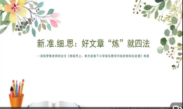 徐建红老师则讲述了自己与张梦雅老师论文《级而上:单元视角下小学音乐教学内容的结构化处理》的“三阅三感”故事展开,以主题《新.准.细.思:好文章“炼”就四法》,带给老师们多样化的视角,多角度的思考和多细节的关注。新——文章之题显新颖(新颖性、趣味性、密切性);准——文章之框呈精准(结构性、逻辑性、层次性);细——文章之例突细活(细微性、灵活性、创新性);思——文章之问发深思。