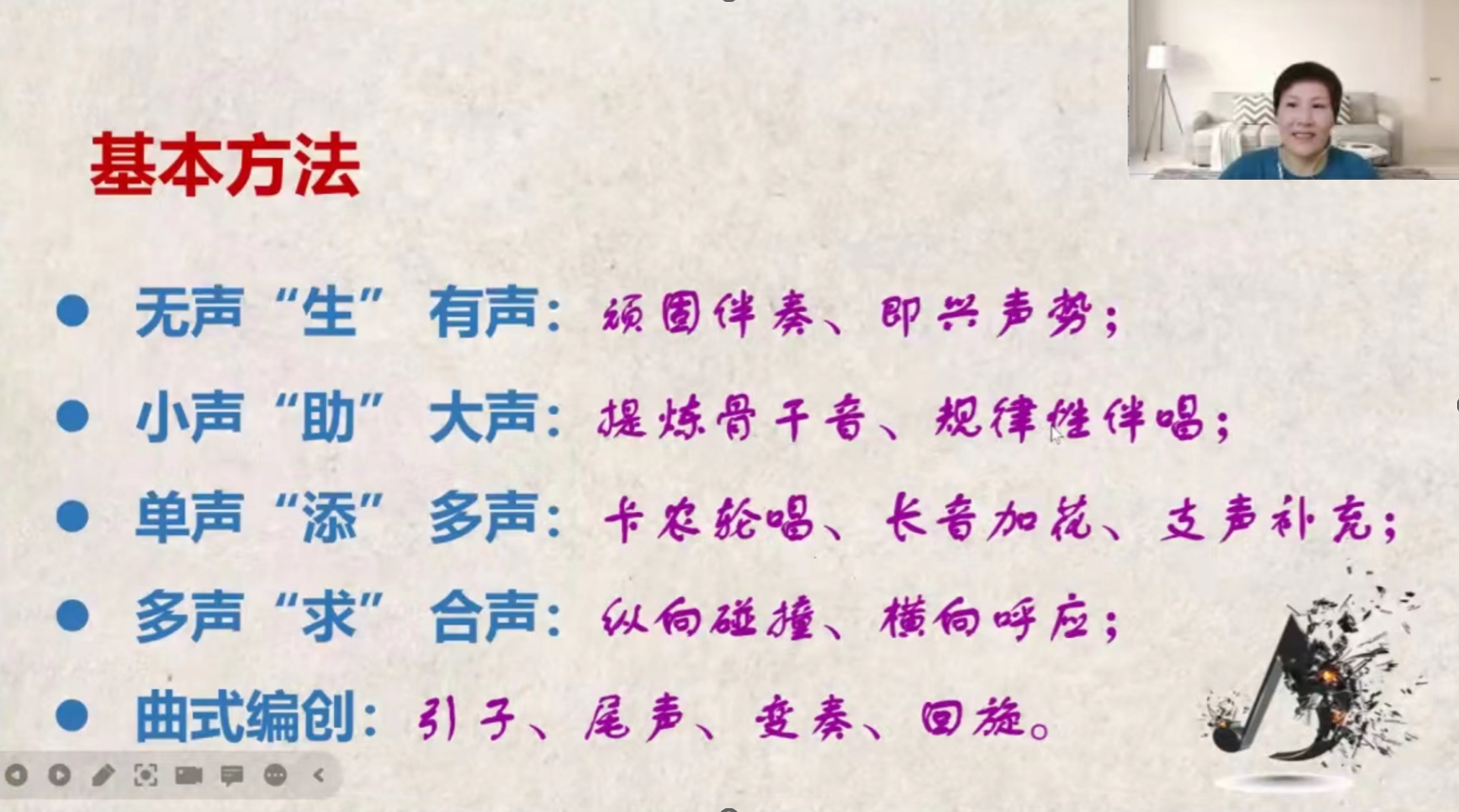 钱老师强调:中小学多声部教学编创有别于专业创作,其和声编配力求手法简洁、功能明确、衔接流畅,既好唱、易记,又能为歌曲加彩添色。基本方法概括:无声“生”有声:顽固伴奏、即兴声势;小声“助”大声:提炼骨干音、规律性伴唱;单声“添”多声:卡农轮唱、长音叠唱、支声补充等……