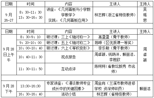 为提升教师专业素养,追寻“有学生、有数学、有技术”的数学课堂。现决定举行林志辉名师工作室几何画板助推小学数学教研展示暨送教下乡活动。具体安排如下: