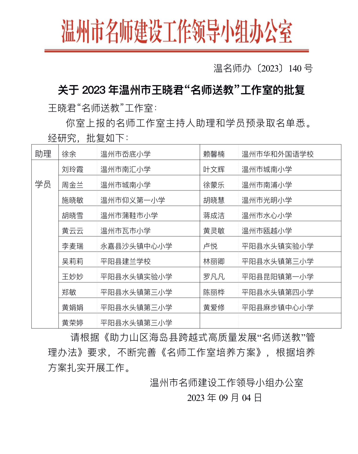 10:30-11:30 | 2023级温州市王晓君“名师送教”班主任工作室开班仪式: 1.平阳县水头镇第三小学领导致辞; 2.区教育局名师办领导讲话,并授牌; 3.工作室主持人、学员代表发言; | ||
