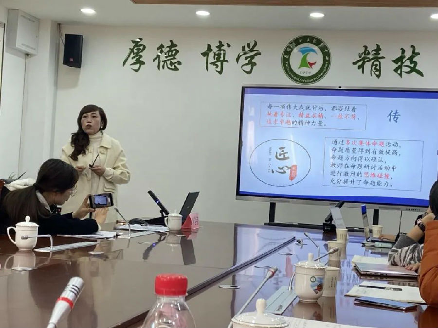 瑞安市职业中等专业学校的市名师叶芸芸老师给我们带来《匠心之美——在命题比赛中绽放光彩》的经验分享。在过程中,叶老师通过匠于心、精于工、品于行、创于新四个环节向我们分享了他们在命题中比赛的经验,让我们深刻领悟了在命题比赛的工匠精神,也让我们了解到财会的命题也可以利用思政铸魂、热点创新。