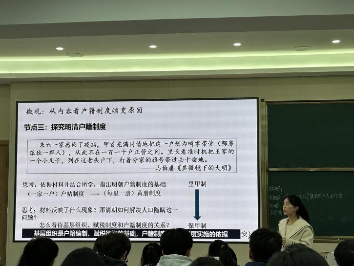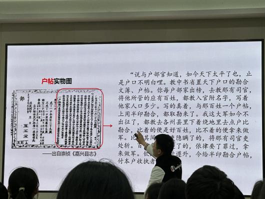 最后,温州中学的郭振豪老师用“制、治、智”三个关键词,以明代为例看中国古代的户籍制度与社会治理。郭振豪老师教态自然,驾驱课堂能力强,整堂课的设计立足于新课标中的核心素养,将作为国家治理体系关键一环的户籍制度与社会治理,置于明代历史环境之下,以一带一的形式,让学生对史料的处理有抓手、可选择、便交流。通过“制+治+智”打造基层治理新格局,推动“中国之治”开辟新篇章。