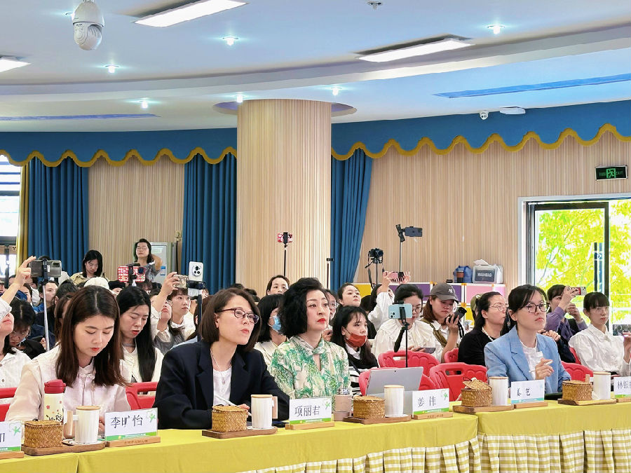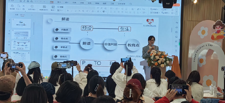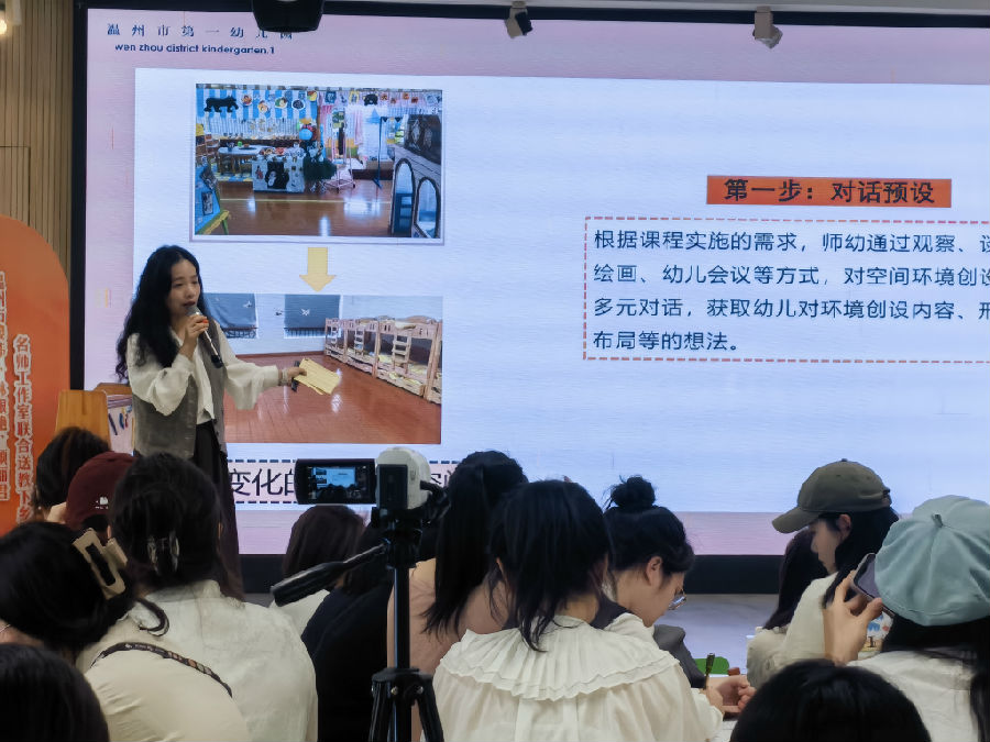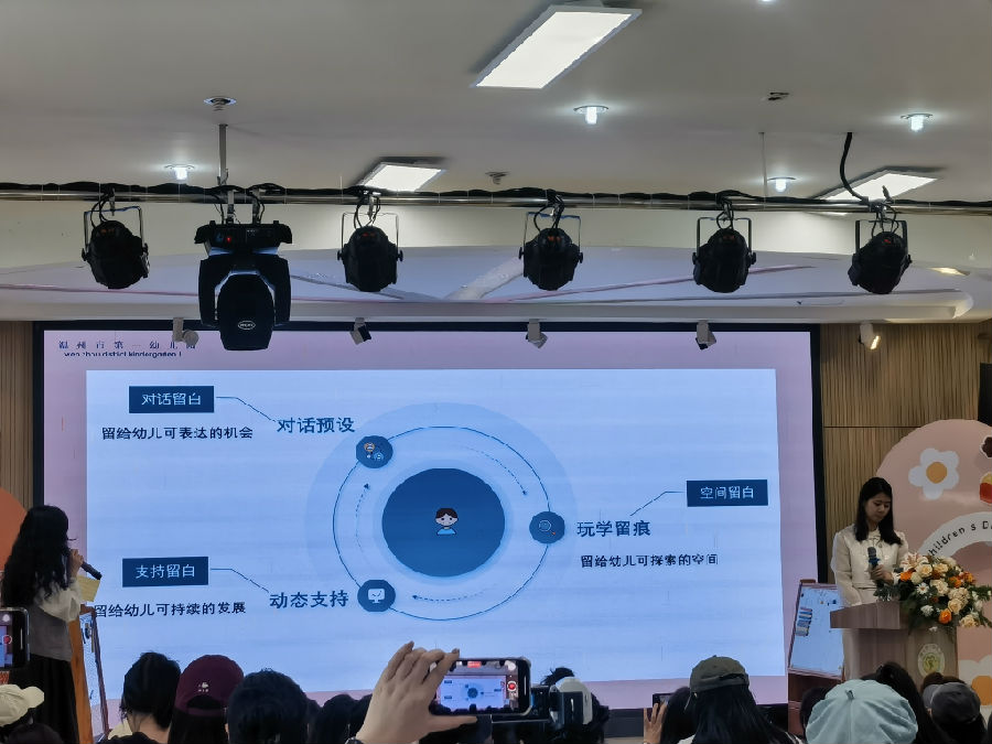 下午场基于“有故事的环境”主题研讨,赵丽娜、李旷怡老师带领大家探寻了温州市九把钥匙之“有故事的环境”,从动态支持、对话预设、玩学留痕三个维度开展教研。就幼儿园当下普遍存在的环境创设问题开展头脑风暴和积极思考,针对《探秘苔藓》和《探秘楼梯》两个鲜活的视频案例开展现场教研,帮助教师提炼出基于儿童需求的“有故事的环境”的多种模式和策略。