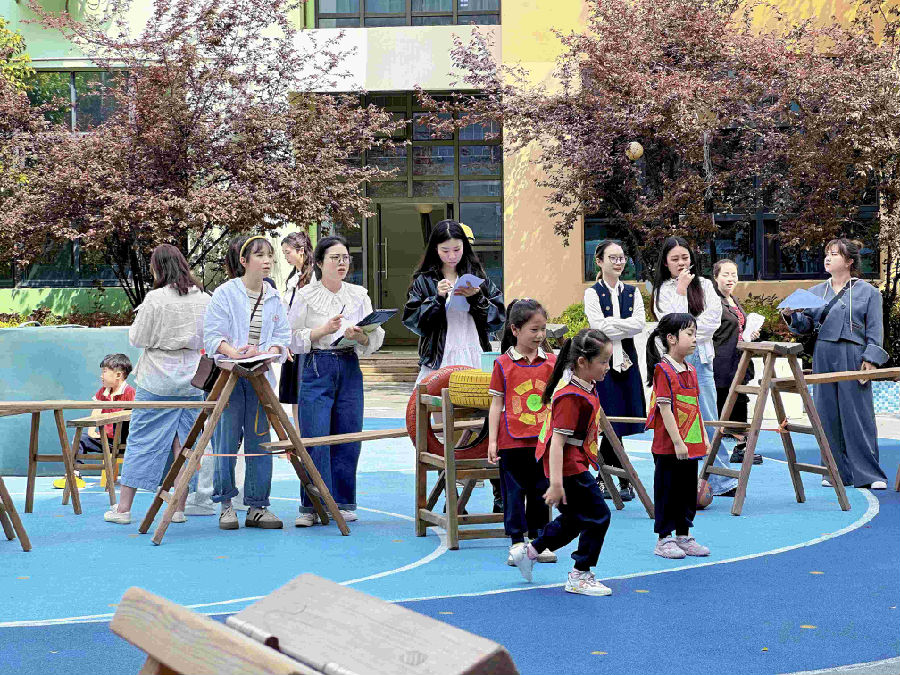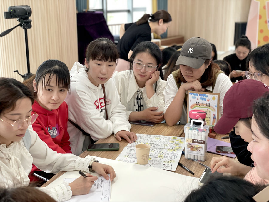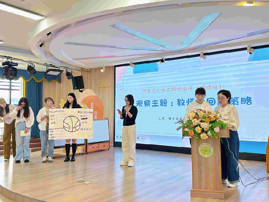 活动在天河中心幼儿园方晓丹副园长的课程分享中拉开序幕,随后,主持人张君如老师带领大家重温“自主游戏链”钥匙的“开锁秘方”,围绕“支持研究”环节,结合《评估指南》中的师幼互动,将老师分成三组,进入孩子们的游戏现场,分别聚焦“捕捉生长点”、“识别幼儿的学习”和“教师的回应策略”进行沉浸式观察与分析。在充分观察的基础上,学员们展开头脑风暴,通过视频、照片、思维导图、AI等形式展开深度研讨,围绕观察点,对标《评估指南》的7条师幼互动观察要点进行解读分析,思考后续教师的支持策略。