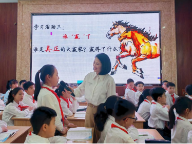 温州森马协和学校的胡颖颖老师展示了课例《田忌赛马》。这节课分为三个板块:怎么赢、为何赢、谁赢了。胡老师先通过小组合作画图示,还原赛马过程中的对阵关系。接着引导学生讨论为什么能赢得比赛,加深对孙膑的人物形象的理解。最后一个环节是思考这场比赛谁是真正的大赢家,赢得了什么,点燃了学生思辨的火花,学生回答角度多样,有理有据。