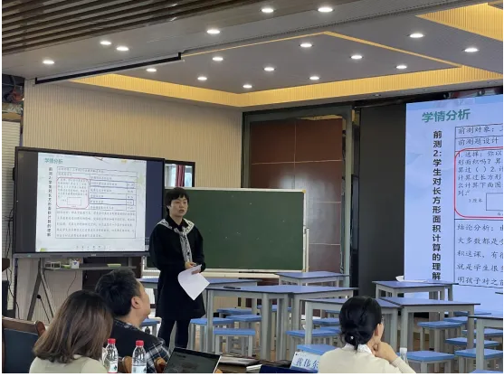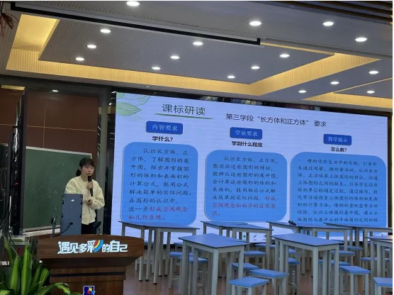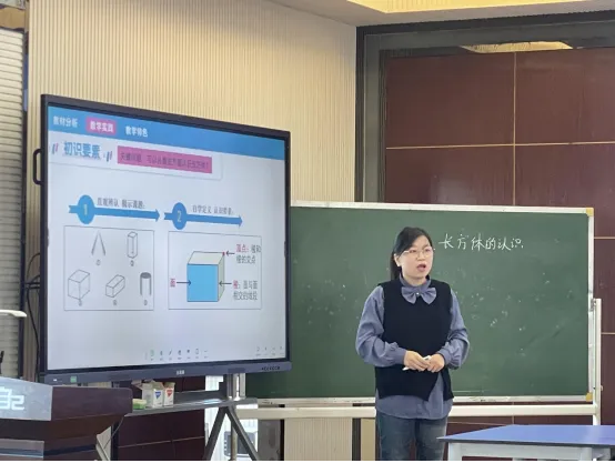 应老师研读课标,确定本单元的素养培育重点在于空间观念,接着纵向分析本单元在小学空间观念培育所处地位,横向对比各版本教材的知识编排结构,确立单元目标,设计在观察中发现,在操作中巩固的教学活动,在“动”中认识,在“动”中感受,在“动”中推导,在“动”中转化,从而培育学生的空间观念。