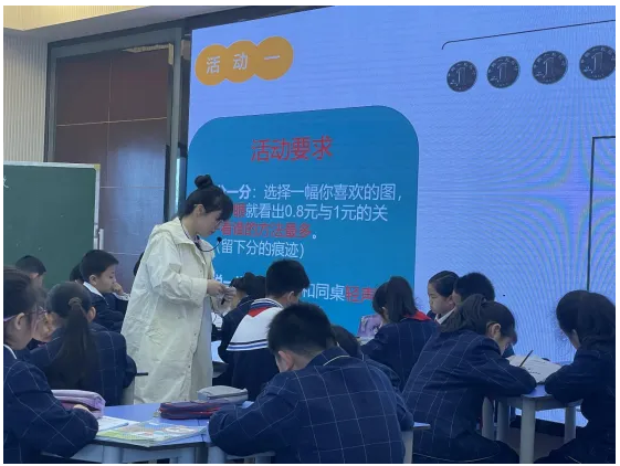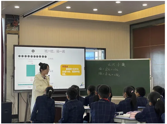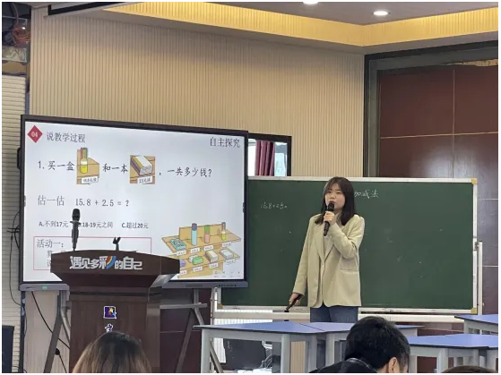 付玲珑老师根据从学生已有的知识经验出发,依托情境提出问题,先通过估一估来培养学生的数感,再通过说一说,算一算让学生感悟同单位的数要对齐。接着自主迁移,探究小数减法的计算方法,并重点讨论5-1.2列竖式计算时5所在的位置,让学生们更好地理解和掌握小数加、减法的算理和算法。