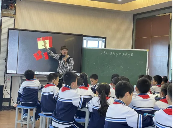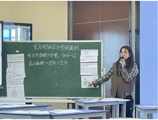 吕黄云老师以直观教学为主,注重实践操作和合作探究。先是让学生自己动手摆、画。通过数、算的方式得到长方形的面积,从铺满的每排4个小正方形和一共有3排,逐步抽象到T字型和只有分割点的图去想象,最后只剩长和宽,在这个过程中发现长方形的面积与它的长和宽有关系:长方形的面积=长X宽,再由此推理正方形的面积。整个教学过程步步深入、环环相扣。学生通过探究活动,观察推理,对长方形和正方形的面积计算公式既知其然,又知其所以然。