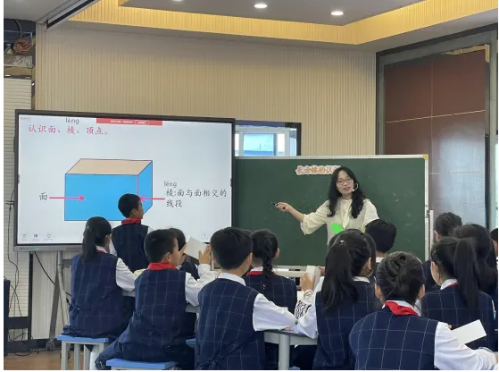 李秀秀老师由点动成线,线动成面,面动成体引出长方体,在教学中多次让学生运用数一数、看一看、量一量等方法发现长方体面、棱、顶点以及长、宽、高等的特征。让学生在“触摸"中掌握知识,有助于激发学习兴趣,提高学习内驱力。接着给学生提供了开放性的材料让学生搭建长方体框架,通过这一实践活动,让学生再现长方体的表象,有效地培养动手操作的能力,进一步发展学生的空间观念。最后通过拆棱,进一步激发学生的空间想象,加深对长方体长、宽、高的理解。