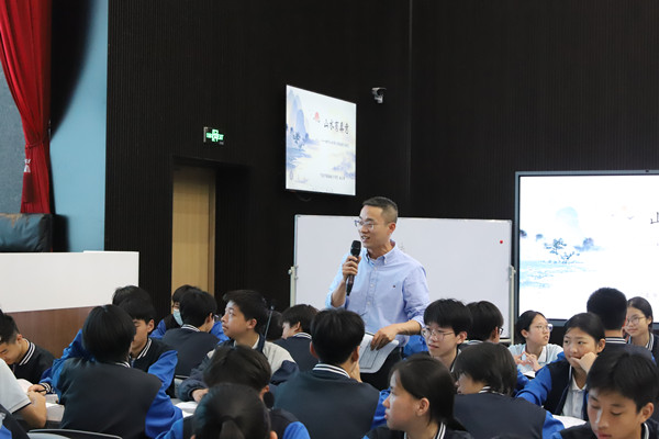 第二节是宁波市名师施云锋老师的示范课《山水有真意——初中山水诗文的梳理与探究》。施老师整理初中山水诗文,从梳理山水诗文基础特点入手,带领学生多维探究解读不同景物形象在山水诗文中的多元意蕴,探究“景”“情”关系,构建山水文人的不同情怀。整节课课堂内容充实丰满,提供的学习材料立足课内,延伸课外,给学生搭建了很好的平台,学生高度参与,层层递进,丝丝入理。