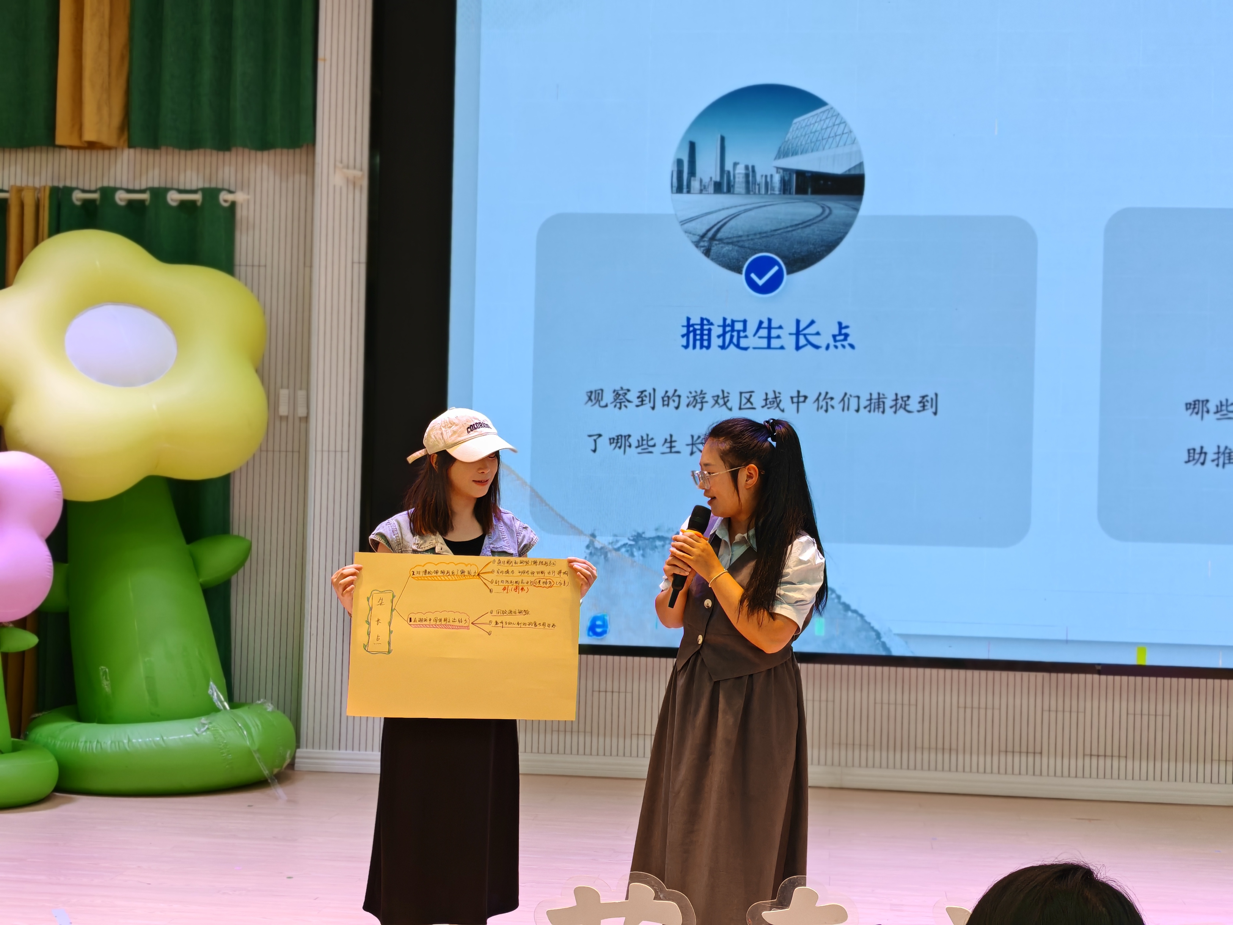随后,老师们带着刚学到的理论知识,走进全域开放的游戏现场进行实操,近距离观察幼儿在游戏中与环境、材料、教师、同伴的互动与探索。观察之后,董雅茹老师根据常态的做法,用集体回想的模式现场开展了游戏回想。