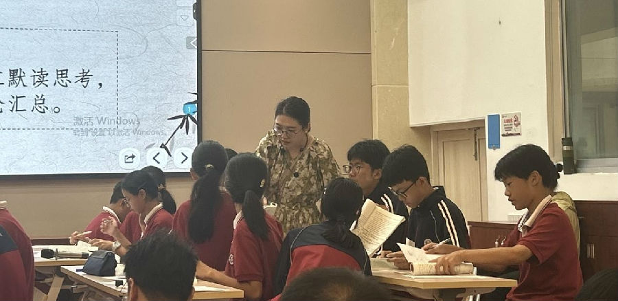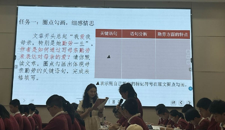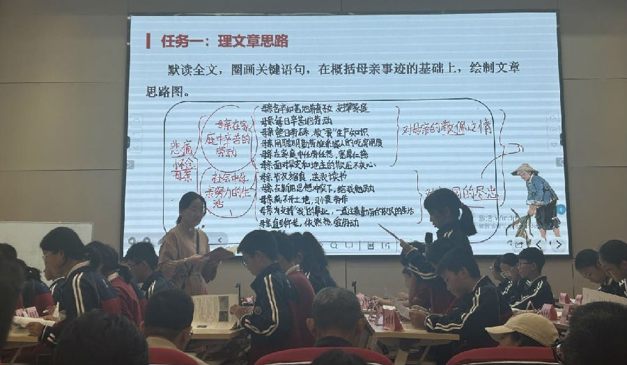 接着,来自龙湾区沙城中学的陈洁琼老师指导学生在默读中抓取概括性叙述句、抒情议论句理清思路;在母子行为探究单的完成中关联概括性叙述句,丰满人物,丰富理解。又在默读中关注抒情议论句,明领袖心怀,感知情思,整堂课通过概括性叙述句与抒情议论句的巧妙结合,勾勒出母亲与朱德的立体形象与交织情感。