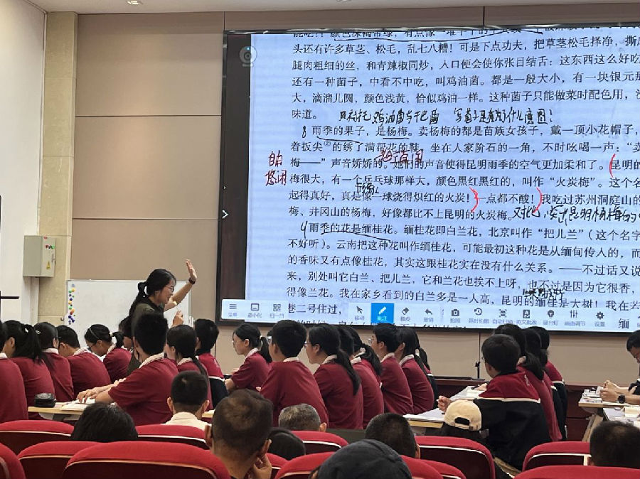 第三节课,来自平阳实验中学的陈梦思老师借助制作汪曾祺写景抒情散文探究册这一驱动性任务,引领学生从选材、语言、情思三个角度感受汪曾祺散文的独特性,完成内页的迭代升级。