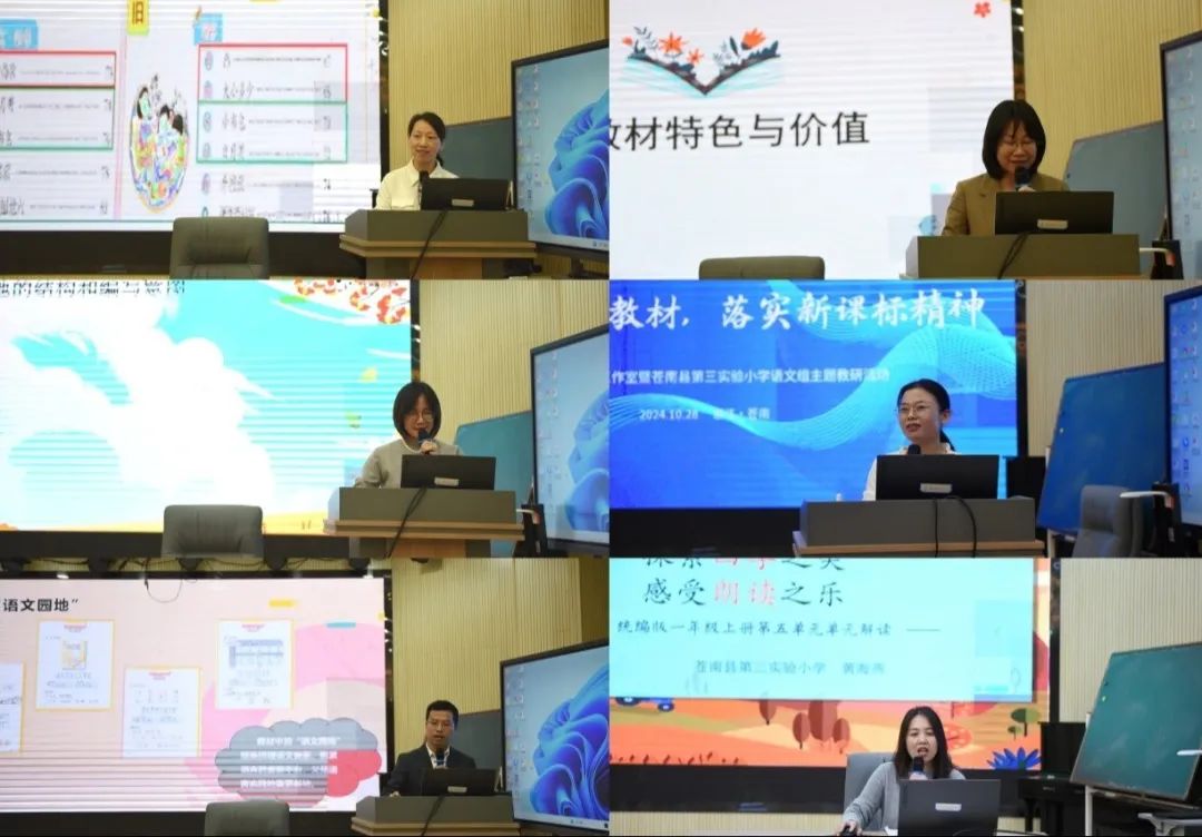 精彩的课例观摩结束后,苍南县第三实验小学一年级组的詹秋歌、蓝德川、黄海燕、杨迎彩、林雪文和沈肖莹六位老师齐聚一堂,对新修订的一年级上册教材进行了单元解读。他们围绕教材的变化、教学目标的设定以及教学方法的创新等方面进行了深入探讨,聚焦新修订教材下“单元整体教学”、“跨学科学习”、“语文学习任务群”等小学语文教研热点问题进行精心地设计,为在场的老师们提供了切实可行的教学建议。