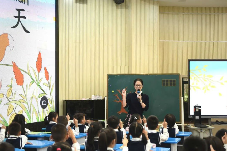 项老师通过多媒体手段展示了学生所熟悉的校园秋天的美景,带领学生快速走入了课文《秋天》的学习情境。在她的引导下,学生学习了“禾”字旁和“木”字旁与其独体字的变化,在与《金木水火土》一课的对比阅读中认识了“自然段”,知道轻声词语的朗读和“一”字的变调。项老师课堂氛围十分活跃,激发了学生的学习兴趣。