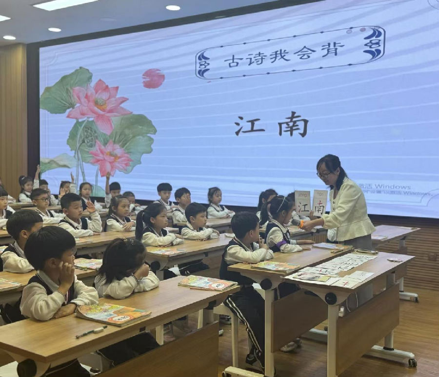 温州市市府路小学张驰老师为大家带来《江南》课例展示。课堂伊始,张老师以学情检测拉开序幕,深度激发学生的学习动机。课中,她借助小鱼卡片等教具,设计了丰富有趣的互动环节。学生通过模仿鱼儿东南西北四个方向的活动,在实践中感受鱼儿在莲叶间嬉戏的灵动与快乐。整节课既注重传统文化的传承,又兼顾学生兴趣的激发,旨在让学生在轻松愉快的氛围中感受古诗的意境和美感,为在场老师提供了可操作的范例。