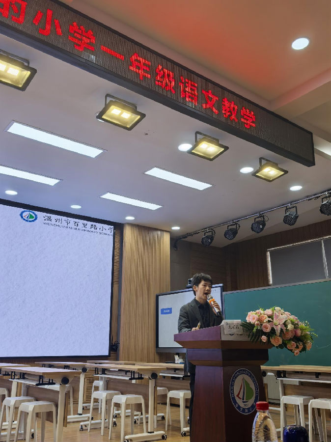 温州市百里路小学毛家昌老师作《汉语拼音学习中个体差异及教学策略》教研分享,毛老师围绕“明晰教材,了解差异”“多维整合,抓好两头”“分层作业,阶梯挑战”及“评价多元,尊重个体”四个方面展开。他分享了学校一年级教研组的做法——详细解读了新版教材的变化,采用“以强带弱”的小组合作模式,设计多层次课后作业,并建立多元评价体系,确保每位学生都能在拼音学习中获得成长。他的精彩分享,为在场的老师提供了切实可行的操作路径。