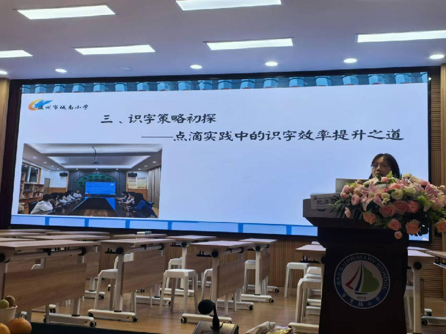 温州市城南小学倪洛阳老师作《“字”有妙法 “识”之有味——关于提高一年级识字效率的策略思考》观点报告。倪老师以一年级上册识字教学为例,从教材解读,学情分析,课例分享3个方面,介绍了如何通过科学的教学方法,引导学生提高识字的效率。倪老师特别提出一线教师需深度解读教材,利用好教材,结合汉字构字规律,系统识字教学,提升学生识字能力,培养学生语文思维,并提倡老师们拓宽教学场域,利用生活和阅读深化识字能力,以拓宽学生知识视野。