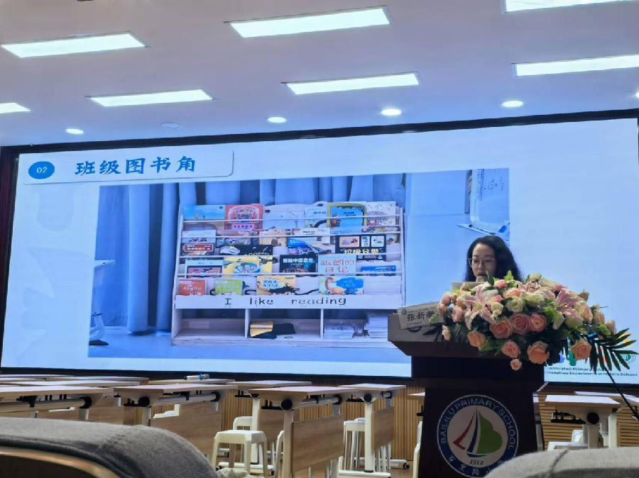 温州市实验中学附属小学张新新老师作《撒下阅读的种子》主题发言,从阅读空间、阅读陪伴、阅读课程、阅读活动四个方面和大家分享了一年级课外阅读的实施策略。阅读地图、阅读树、阅读云梯等有趣、可视化、好操作的阅读打卡,不仅激发了孩子们的阅读兴趣,也为家长提供了亲子阅读的支持。张老师的分享干货满满,启发了老师们推进课外阅读的新思考。