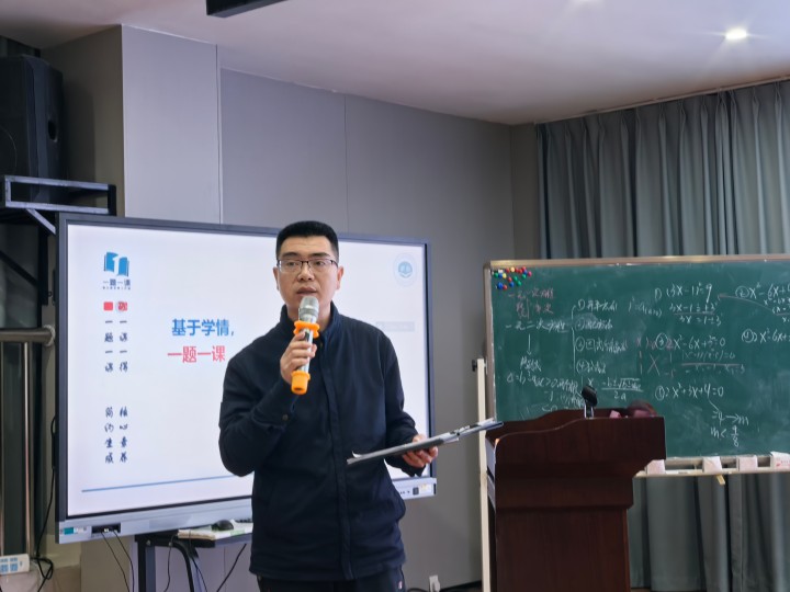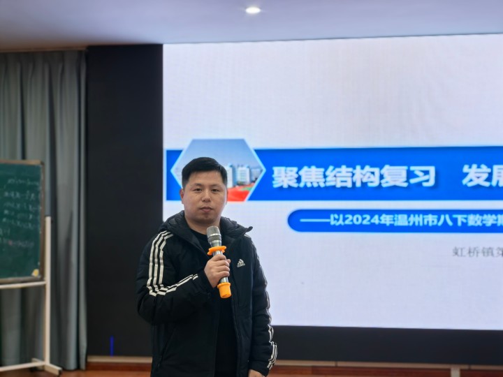 接着,虹桥镇第二中学的周东冬老师进行专题发言《聚焦结构复习,发展核心素养——以平行四边形复习为例》。周老师对2024年温州市八下期末第20题进行说题展示,从题目来源与命题立意分析出发,充分考虑学情,加注学生核心素养,设计相应的教学目标。整个过程条理清晰,层层递进,既帮助学生建立知识结构,方法结构,模型结构,又高效的实现课堂教学,发展核心素养。