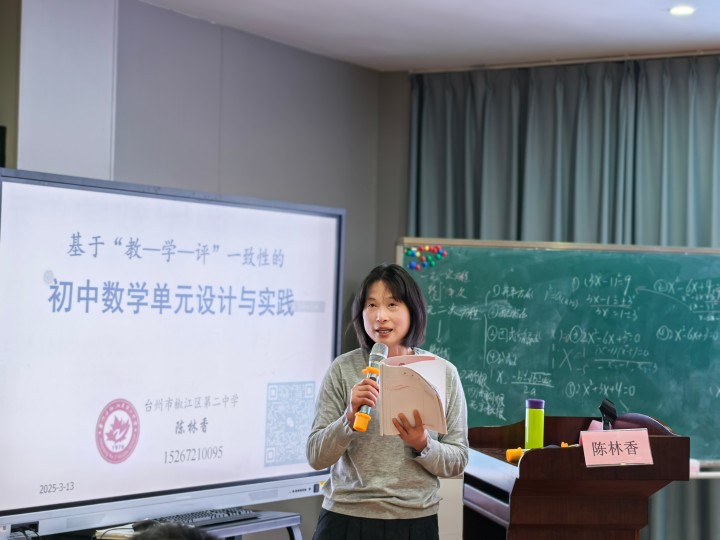 然后,来自台州市椒江二中的台州名师陈林香老师带来精彩的专题讲座《基于“教—学—评一致性”的初中数学单元设计与实践》,她首先对周骏老师的公开课进行点评,称赞其课堂收放自如,是一堂学生有回答,教师有回应的有效课堂。同时指出让学生总结解法,并对最后如何收回到因式分解提出一些改进。接着,陈老师以当前的教育问题为切入点,结合数学新课程标准,探讨教—学—评一致性产生的背景及意义,并给出对于教学目标,教学内容,教学方法,教学评价的理解。从数学学习与教学研究背后几个逻辑出发,从代数和几何方面给出如何进行单元教学的设计与实践。结合一元二次方程、分式以及平行四边形等课例,阐述进行整体性的,大单元的教学设计。