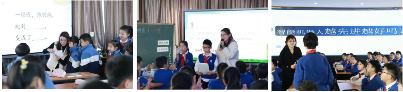 戚玲佩老师执教低段创意表达课《千变万化的线》。戚老师以句式为支架,以画为媒介让孩子们展开想象,开启一段奇妙的创作之旅,并鼓励学生大胆向在场老师表达想法。中段的创意表达课《如果课间有1小时》由金慧泉老师执教,有效拓展了学生的写作内容,激发他们的表达欲望。章悦悦老师带领高段学生思考创意话题《智能机器人越先进越好吗?》。她鼓励学生关注热点,大胆想象,开展辩论,在写作中深度思考科技带来的机遇与挑战。