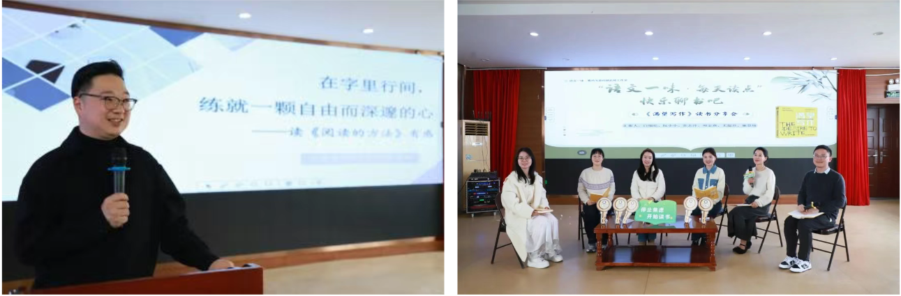读书分享环节,陈忠朗老师分享书目《阅读的方法》,探索了阅读的多种可能,分享了书中的阅读艺术与技巧。阮小小、张志萍、白瑞伦、项金燕、尤温莎、施慧瑜分享《渴望写作:创意写作的五把钥匙》一书,五位老师以“意图”“行动”“快乐”“情感”“想象”为关键词,结合自身教学实践为例证,点燃学生对写作的热情。