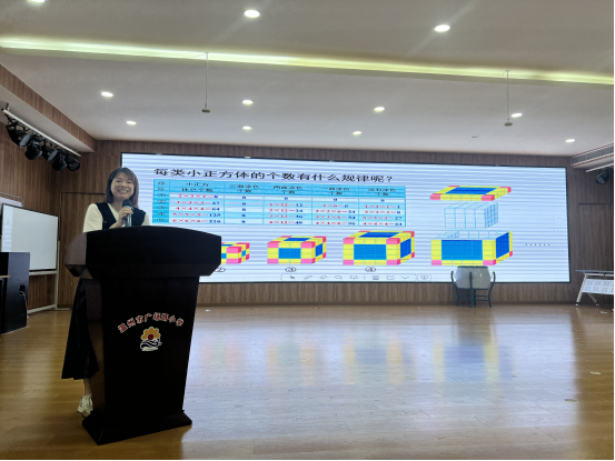 周老师以“大正方体切割后各类小正方体数量规律”为切入点,通过几何画板动态演示,引导学生从“三面涂色→两面涂色→一面涂色→无涂色”逐层抽象,构建n阶正方体的数学模型。其“猜想-验证-归纳”的探究范式,展现了如何将直观想象转化为数学推理。