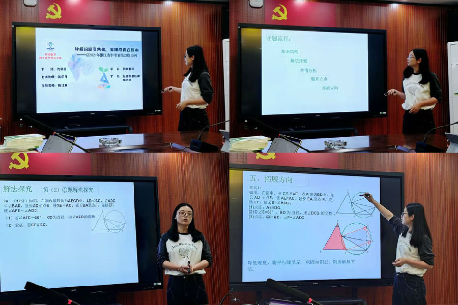 白石中雁学校的钱乐丹老师作题为《妙解纷呈寻共性,返璞归真在课本》的专题发言。她以2024年浙江省中考数学卷第24题为例,系统梳理全等构造、圆的性质应用、相似转化及基本图形化归四种解题路径,强调教材习题的拓展价值。钱老师提出"以课本为基,以过程为本"的教学策略,建议通过画图活动与多解训练培养学生的几何直观与逻辑链构建能力。钱老师的分享让工作室成员重新审视课本习题的“种子”作用,今后将更注重挖掘教材中的思维生长点。