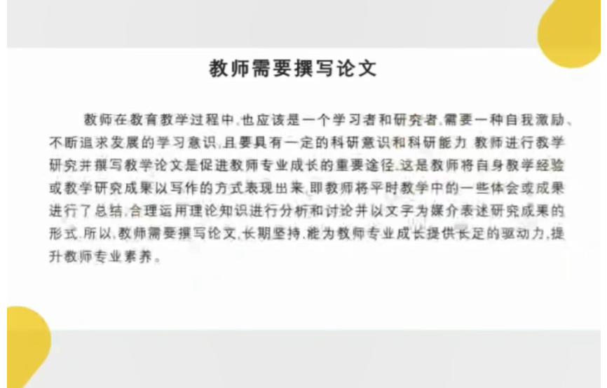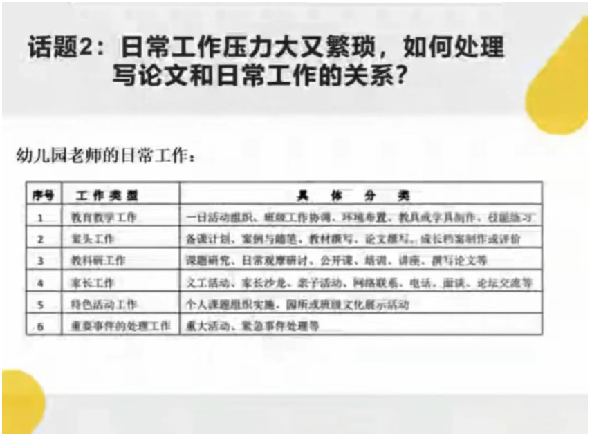 虞老师在开始讲座前,抛给我们第一个话题:“幼儿园教师在繁忙的工作中要不要写论文?”引发了大家的思考。论文,是教师将日常工作中的经验与研究进行总结,并运用理论知识分析讨论的成果。对于幼儿园教师而言,写论文是专业成长的重要过程。通过写作,教师可以反思教育实践,提炼总结经验,将实践与理论结合,提升专业素养。写作过程能促使教师深入思考,是专业成长的重要驱动力。幼儿园教师日常工作繁琐,包括教育教学、家长工作、案头工作、教科研工作等。